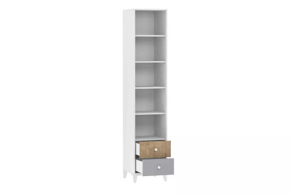 Шкаф-пенал «Морти» – обустроен 5 нишами-полками  и двумя выдвижными ящиками, что превращает его в удобное и вместительное место для хранения. Такой шкаф хорошо использовать для декорирования комнаты. Вы можете легко вписать этот предмет интерьера в пространство любой площади.
