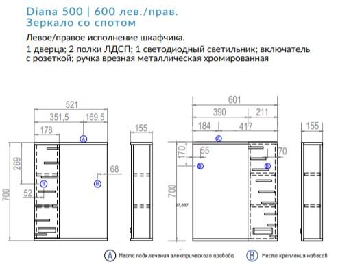 Зеркало Diana 600 левое со спотом