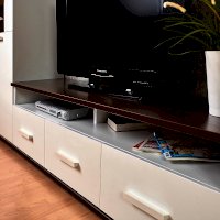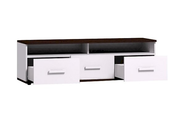 Норвуд 3 Тумба ТВ в белом минималистичном дизайне гармонично дополнит любую современную гостиную. Яркий акцент тумбы - контрастные верх и низ толщиной 22 мм в декоре Орех шоколадный. Три выдвижных ящика на шариковых направляющих плавно и бесшумно открываются за светлые ручки из массива дерева. Утопленная вглубь перегородка открытой ниши создает ощущение легкости и воздушности. На невысокой тумбе можно разместить телевизор диагональю до 65''.