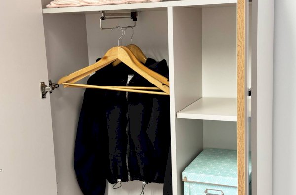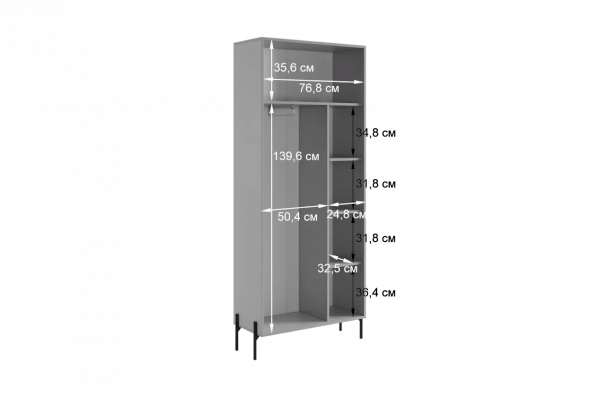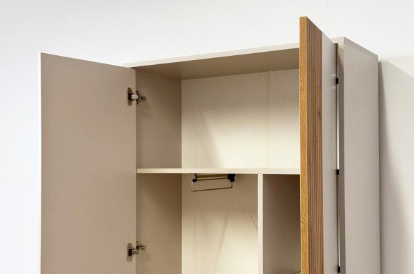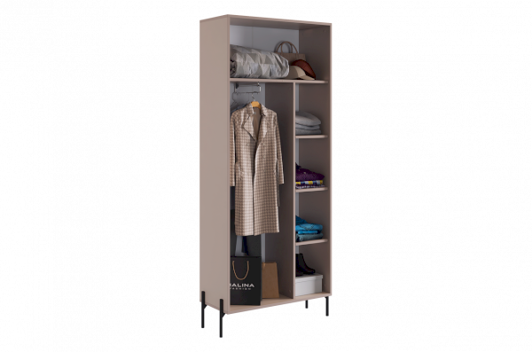 Шкаф "Доминика" оснащен глухими фасадами, скрывающими за собой просторное внутреннее пространство. На одной стороне шкафа находится штанга для одежды, обеспечивая удобное место для хранения одежды на вешалках.
