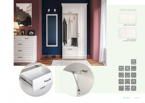 Популярный колониальный стиль, хорошо зарекомендовавший себя в гостиных, теперь доступен и для прихожей. Эти модули подходят к модулям гостиной и спальни Ливерпуль, делаются в тех же декорах, в том же стиле и могут компоноваться друг с другом.