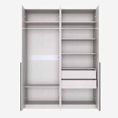 Распашной шкаф имеет 4 дверцы с 2 длинными профильными ручками. За двумя левыми дверями расположена антресольная полка сверху, отсек для хранения внизу, платяной отсек с горизонтальной штангой во всю длину. За двумя правыми дверями расположено: 2 выдвижных ящика, укороченный плательный отсек с горизонтальной штангой во всю длину, антресольная полка и отсек для хранения внизу. Комбинированная модель позволяет использовать её сразу в качестве плательного и бельевого шкафа, где можно разместить гардероб, одежду, белье, обувь и другие вещи.