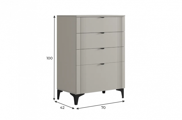 Комод изготовлен из качественных материалов: корпус выполнен из ЛДСП, что гарантирует прочность и долговечность, а фасад, выполненный из МДФ в плёнке ПВХ, не только выглядит эстетично, но и защищает комод от повреждений. Особое внимание заслуживает фрезеровка фасадов, которая придаёт изделию изысканный вид.