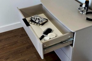 Благодаря своему дизайну комод «Катрин» легко сочетается с другими модулями спальни «Катрин». Выкатные ящики предоставляют достаточно места для хранения различных предметов, что делает этот комод практичным и удобным элементом мебели.
