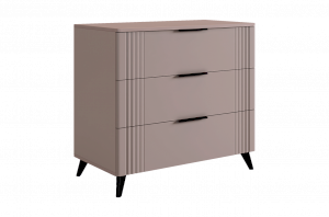 Комод изготовлен из качественных материалов: корпус выполнен из ЛДСП, что гарантирует прочность и долговечность, а фасад, выполненный из МДФ в плёнке ПВХ, не только выглядит эстетично, но и защищает комод от повреждений. Особое внимание заслуживает фрезеровка фасадов, которая придаёт изделию изысканный вид.
